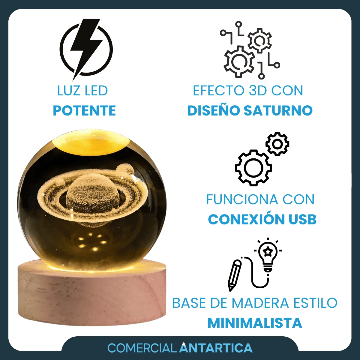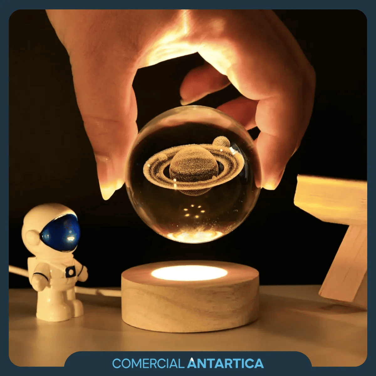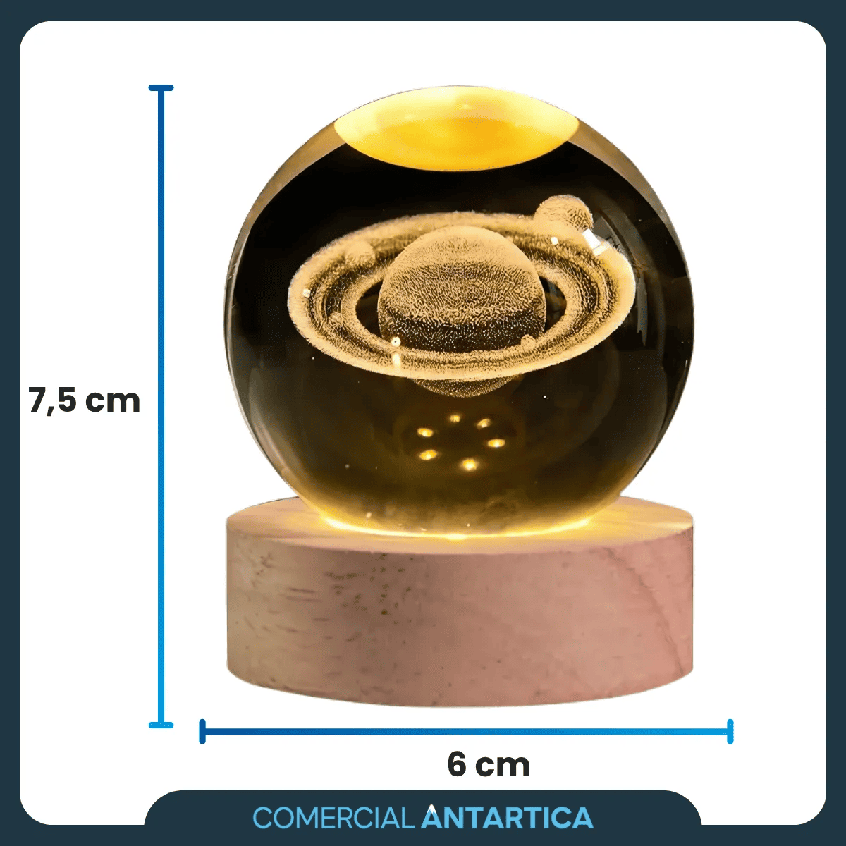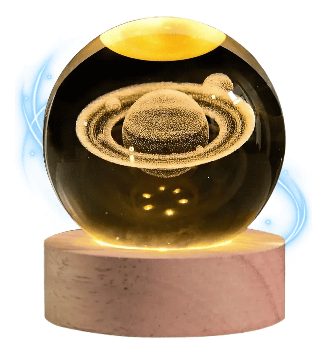 Iluminá tus noches con un toque mágico gracias a la Lámpara Esfera de Cristal 3D Led Saturno con Base de Madera.