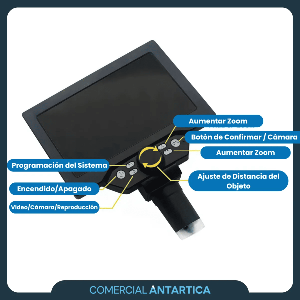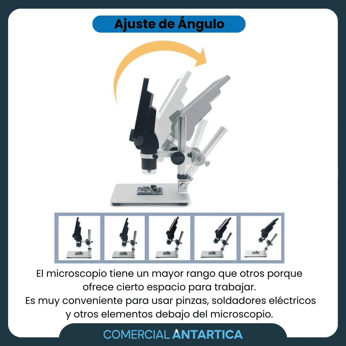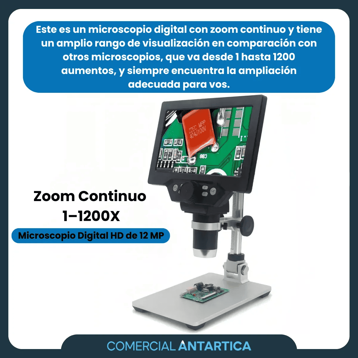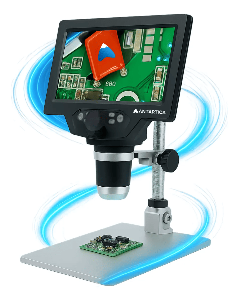 El Microscopio Optico Antartica Digital 1200x Pantalla Lcd Full Hd Usb es ideal para inspecciones precisas en electrónica, joyería, hobbies o educación. No necesita conectarse a una computadora para visualizar, y cuenta con puerto USB para alimentar el dispositivo o guardar fotos y videos en tarjeta micro-SD. Su luz LED regulable y base metálica giratoria ofrecen practicidad y control total.