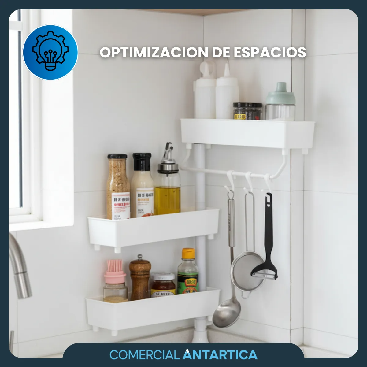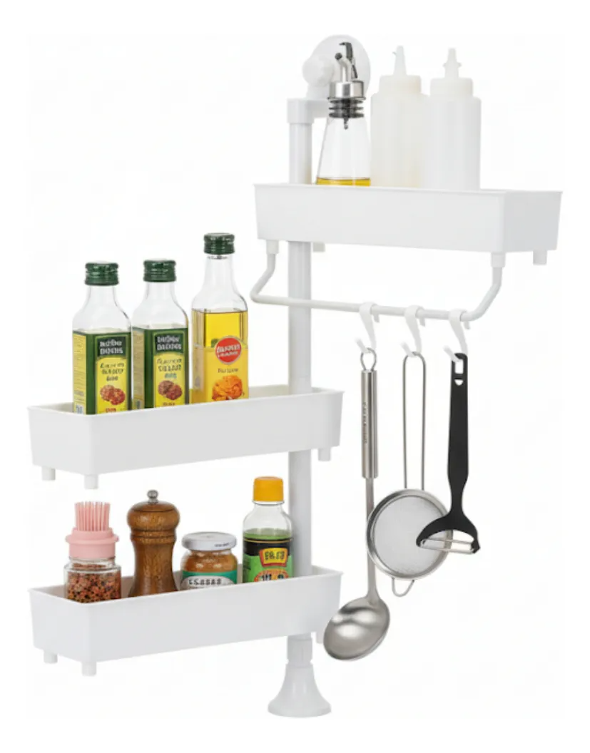 Organizador giratorio de 3 estantes con altura regulable, ideal para especias, condimentos, frascos y pequeños utensilios de cocina. Su diseño práctico permite aprovechar al máximo el espacio disponible, manteniendo todo al alcance de la mano de forma ordenada y accesible.