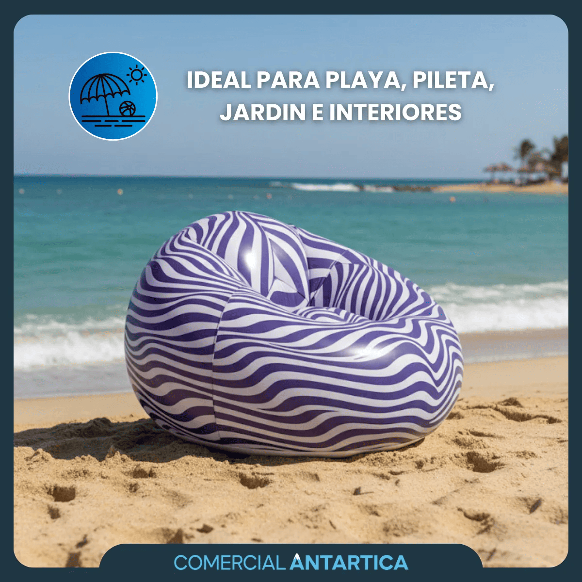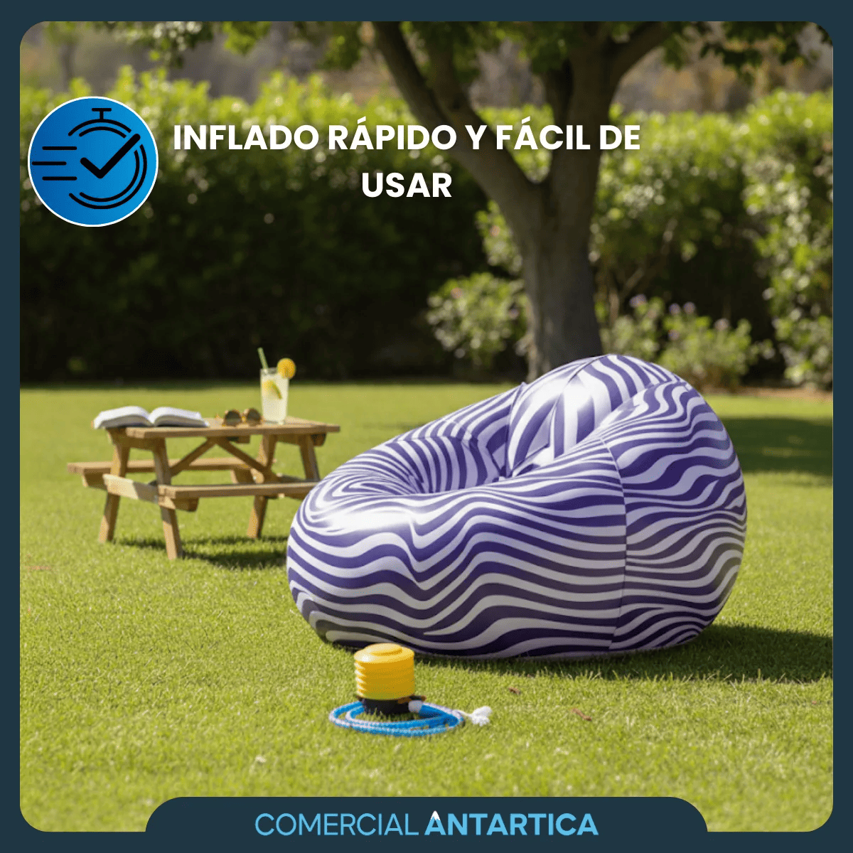Sofá inflable tipo sillón de aire, cómodo y práctico. Ideal para uso en interiores o exteriores, brinda descanso inmediato gracias a su diseño ergonómico y resistente. Se infla fácilmente y es liviano para transportar, convirtiéndose en una opción versátil para el hogar, camping, playa o jardín.