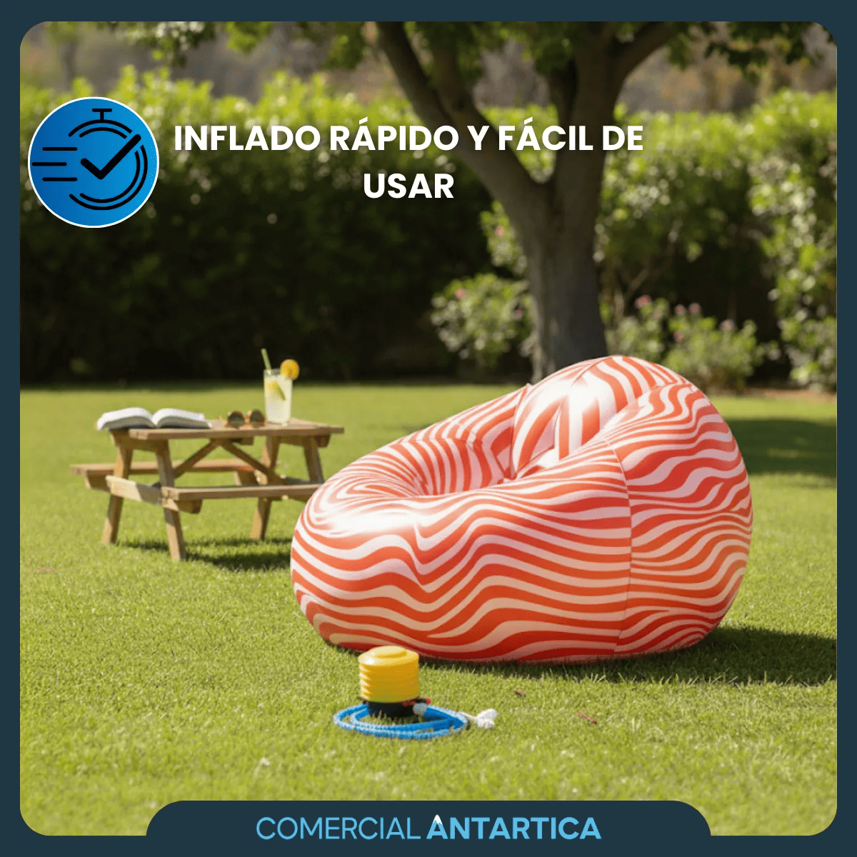 Sofá inflable tipo sillón de aire, cómodo y práctico. Ideal para uso en interiores o exteriores, brinda descanso inmediato gracias a su diseño ergonómico y resistente. Se infla fácilmente y es liviano para transportar, convirtiéndose en una opción versátil para el hogar, camping, playa o jardín.