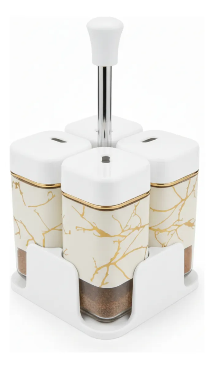 Especiero cuadrado de acero inoxidable y vidrio, modelo SET X4. Con altura de 10 cm y ancho de 5 cm, cada frasco cuenta con un diseño elegante con efecto mármol, ideal para darle un toque moderno y sofisticado a tu cocina. Perfecto para mantener tus condimentos organizados y siempre a mano.