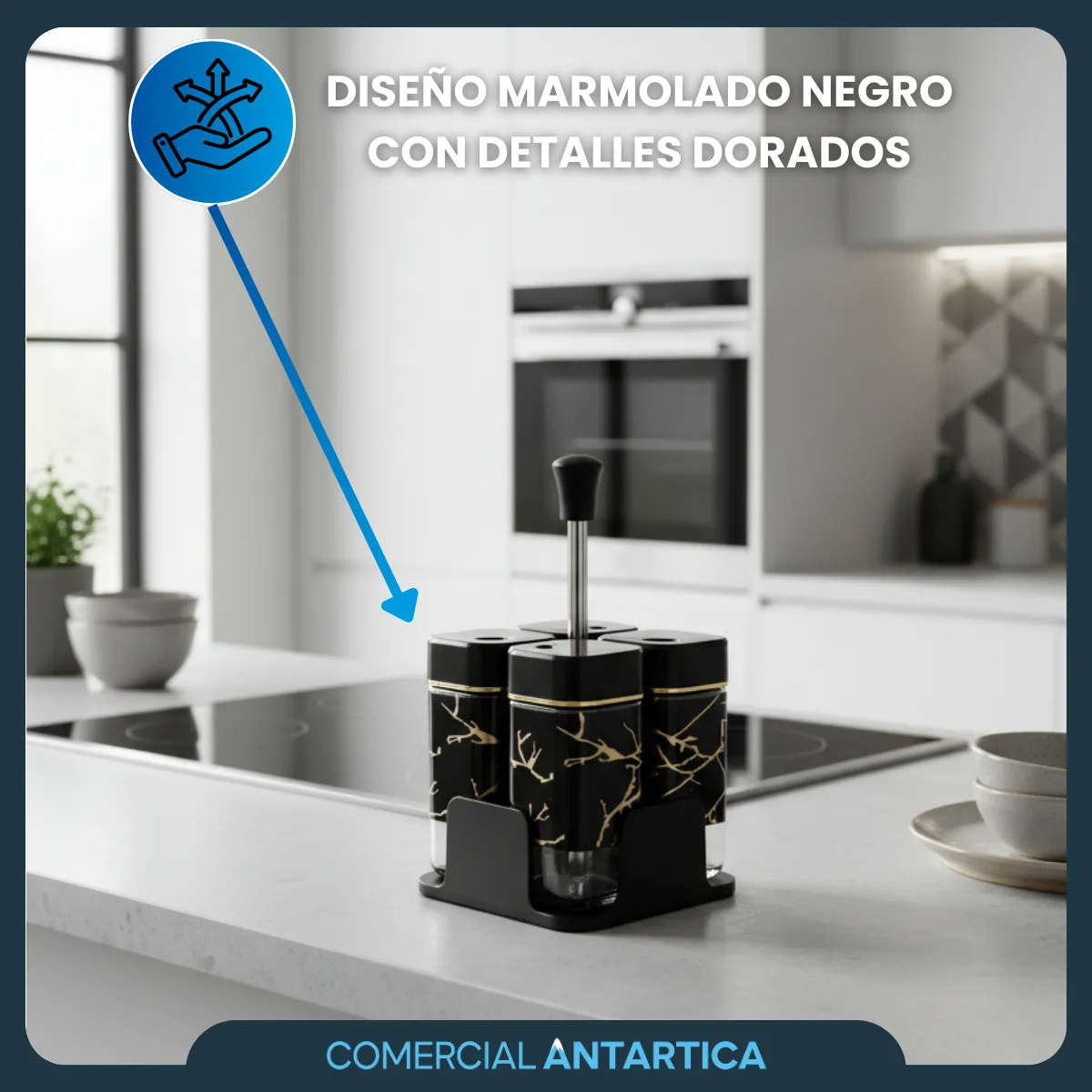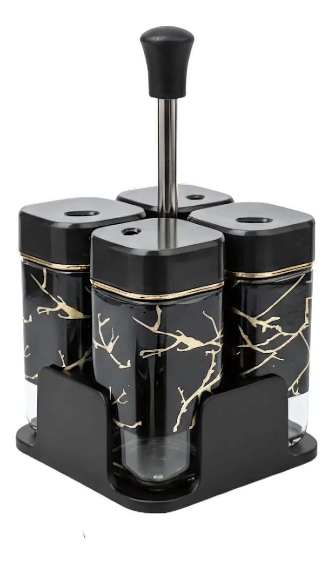 Especiero cuadrado de acero inoxidable y vidrio, modelo SET X4. Con altura de 10 cm y ancho de 5 cm, cada frasco cuenta con un diseño elegante con efecto mármol, ideal para darle un toque moderno y sofisticado a tu cocina. Perfecto para mantener tus condimentos organizados y siempre a mano.